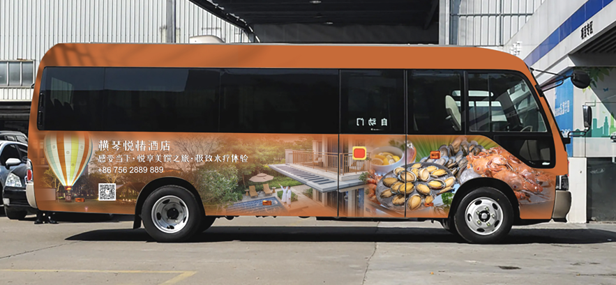 巴士 2 車身印有 「橫琴悅椿酒店」Logo。