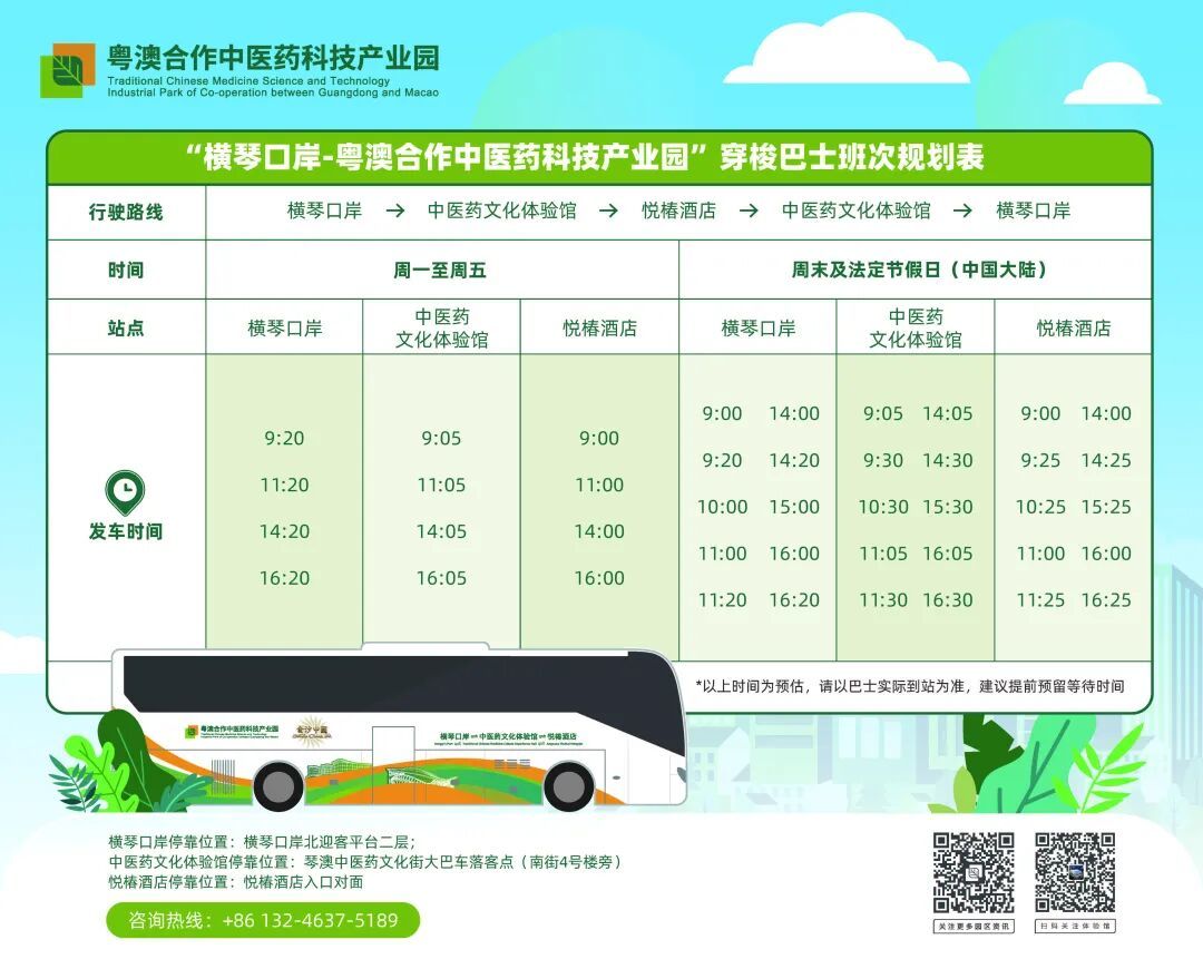 穿梭巴士沿「橫琴口岸⇌粵澳合作中醫藥科技產業園」往返,設 3 個停靠站點,可免費乘坐。